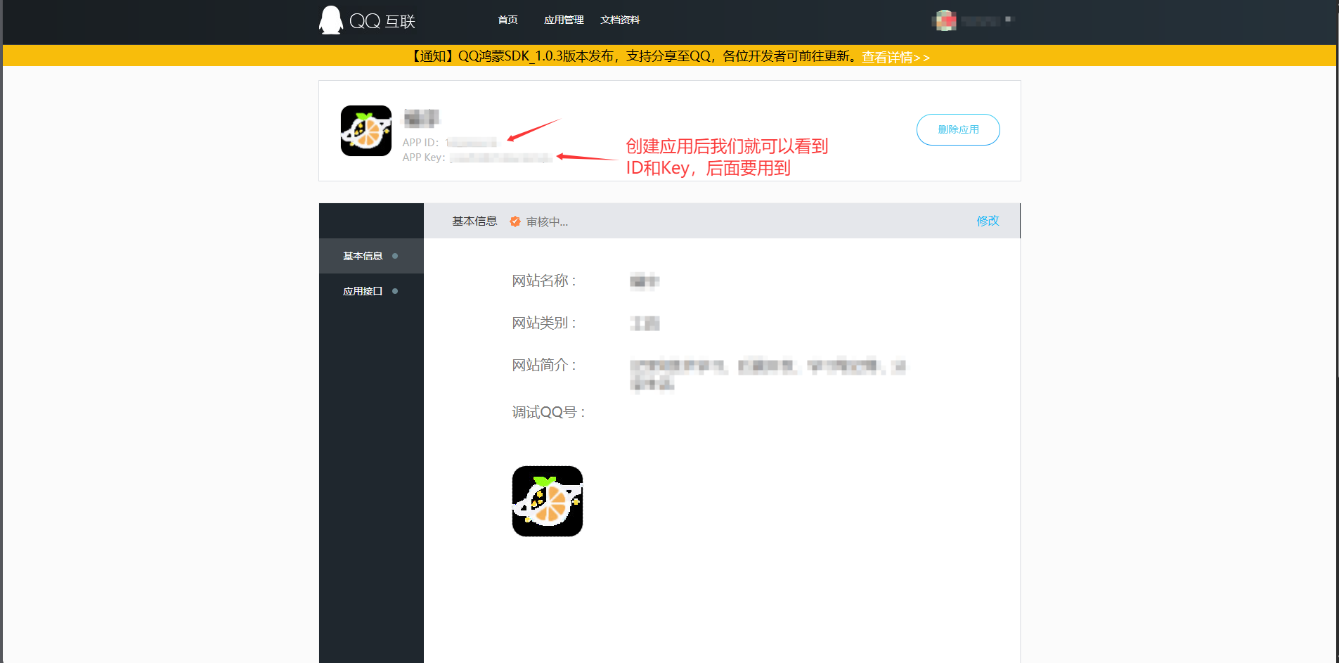 完成应用的创建后会等待审核,在此期间我们需要将得到APP ID以及APP Key进行下一步配置,实现登录跳转到QQ