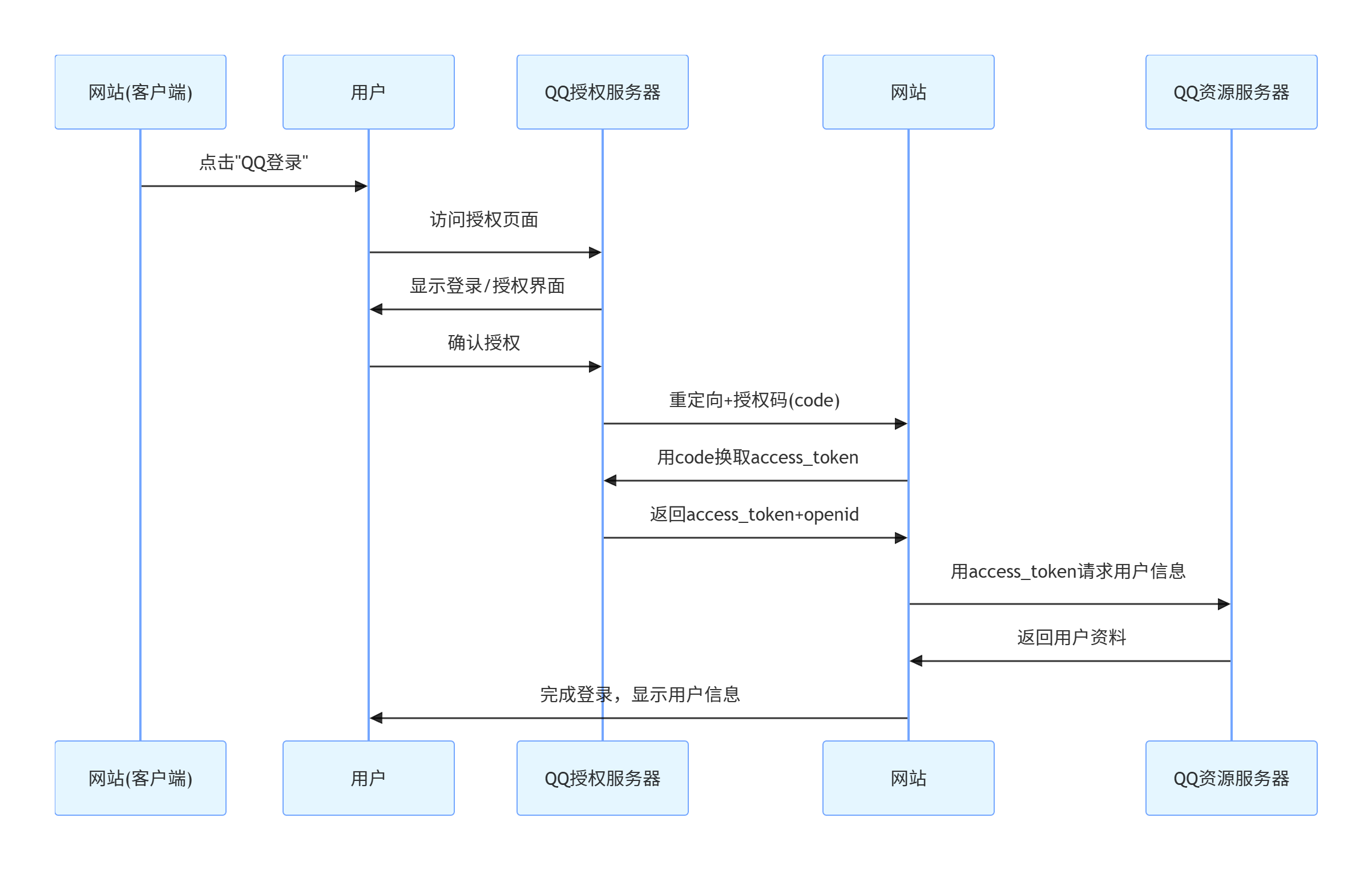 - 用户发起登录:用户在你的网站点击 “QQ 登录” 按钮。
